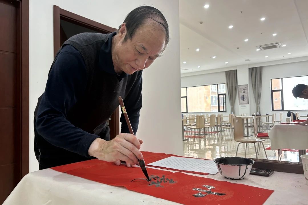 活動(dòng)現(xiàn)場(chǎng)氣氛火熱,墨香撲鼻,五張方桌“L”形排開(kāi),書(shū)法家們揮毫運(yùn)墨,隨著他們筆鋒的轉(zhuǎn)動(dòng),一副副對(duì)聯(lián)、“福”字寓意吉祥的春聯(lián)躍然紙上,書(shū)寫(xiě)出辭舊迎新的美好前景。“龍騰已是清新地;蛇舞又將明媚天。紫燕歸巢春有約;金蛇賀歲福無(wú)邊。賀歲當(dāng)邀新燕舞;點(diǎn)睛試看小龍飛。銀蛇起舞開(kāi)春序;紫燕飛歌奏福音。蛇盤福字千家滿;蝶變春風(fēng)萬(wàn)里新。小龍接福呼春至;大夢(mèng)催人拓業(yè)忙。”
