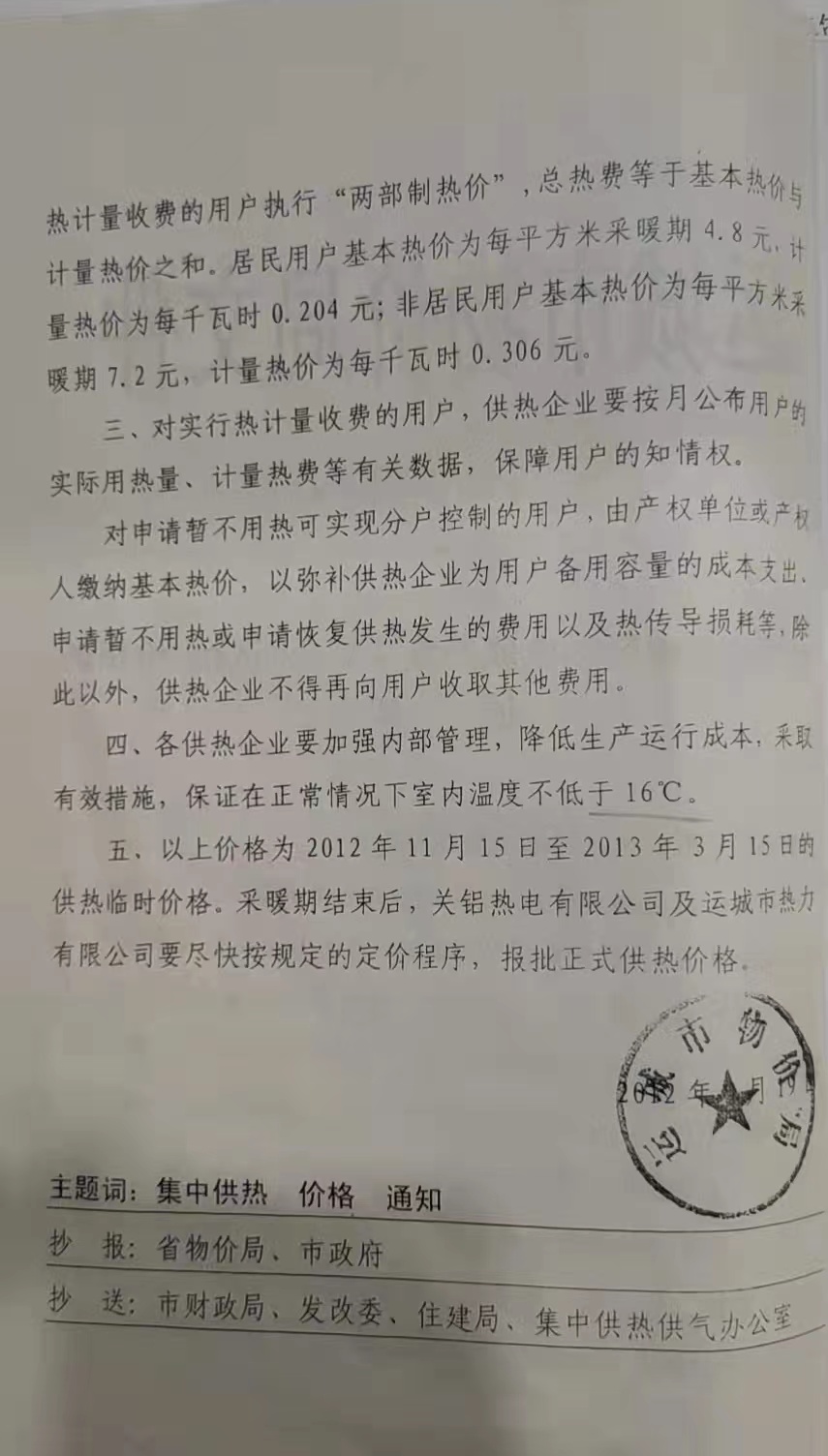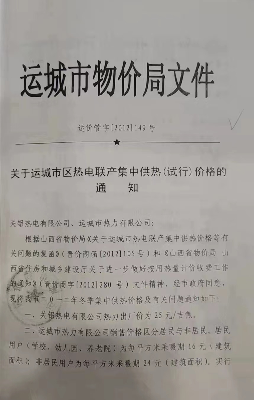關(guān)于運(yùn)城市城區(qū)熱電聯(lián)產(chǎn)集中供熱(試行)價(jià)格的通知